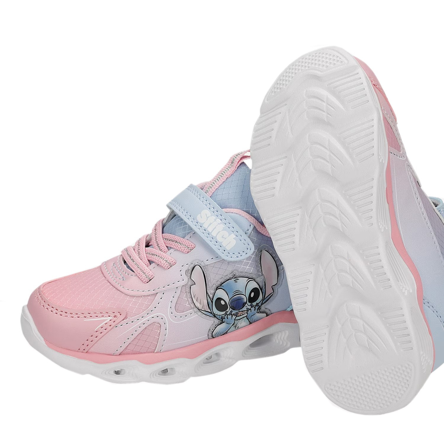 Wykonane z miękkich materiałów. W zewnętrznej stronie buta znajduje się bohater znanej bajki Lilo i Stitch. Buty wyróżniają się aplikacją oraz wbudowanymi diodami LED, które świecą przy każdym kroku w podeszwie.