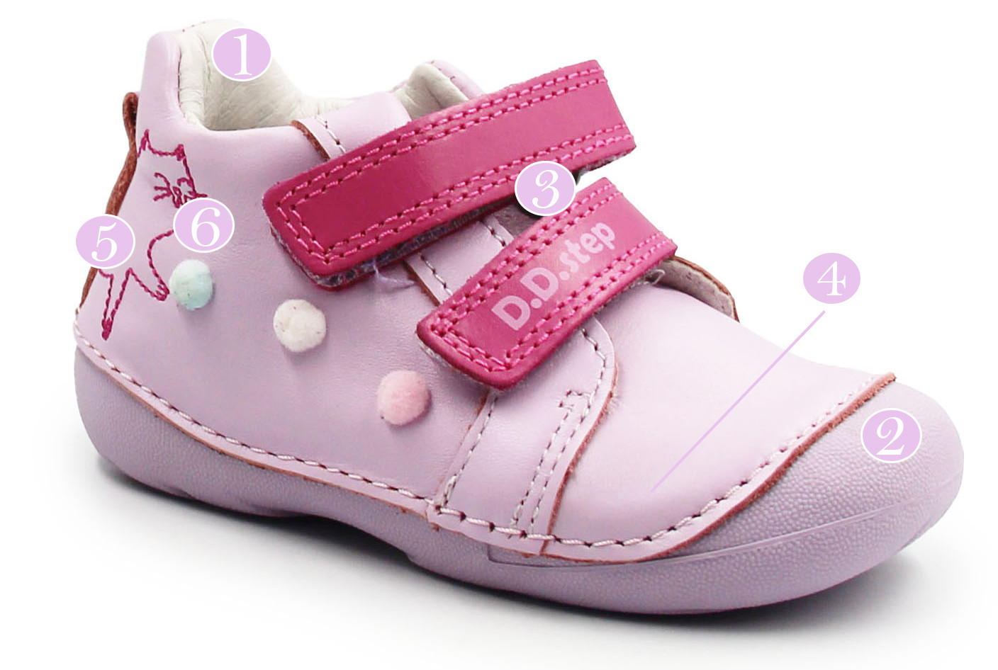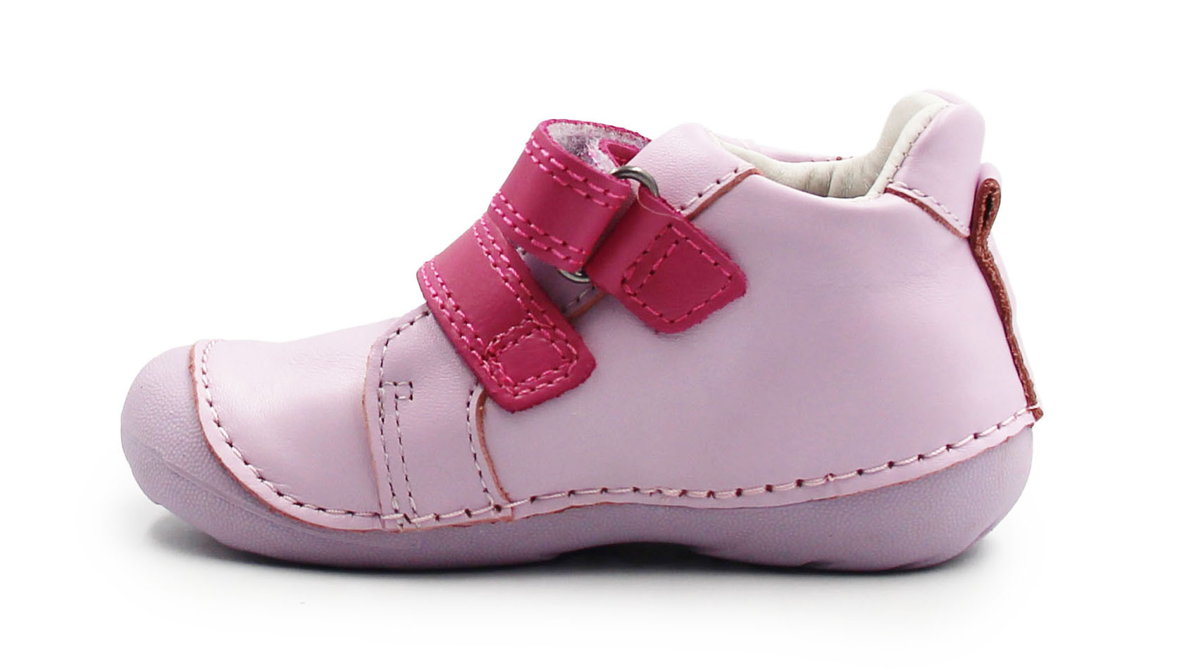 Zarówno z zewnątrz, jak i w środku, wykonane są z miękkiej skóry, co zapewnia komfort i odpowiednią wentylację dla stóp. Ich elastyczna, miękka podeszwa zapewnia swobodę ruchów. Zapinane za pomocą dwóch rzepów, co jest praktyczne oraz szybkie, a dodatkowo umożliwia dziecku samodzielne zakładanie. Buty posiadają szersze czubki, co daje więcej miejsca z przodu na paluszki, przez co mogą one zachować naturalne ułożenie.
