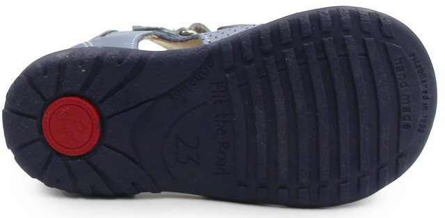 Czerwony punkt na podeszwie sandałów Emel es 2437-46 to oznaczenie punktu środka ciężkości stopy. Znajduje się on na podeszwie pod piętą dziecka i ma za zadanie ułatwić prawidłowe ułożenie stopy podczas chodzenia.