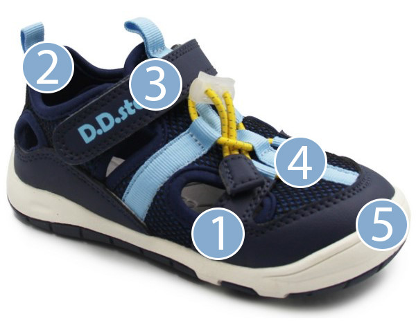 2️⃣ Podwyższony zapiętek chroni stopę dziecka przed urazami i obtarciami.
