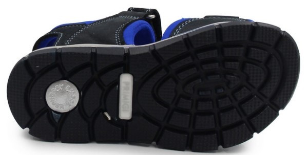Chłopięce sandały wykonane z miękkich tkanin. Wkładka posiada kilka warstw, co zapewnia miękkość i amortyzację podczas chodzenia. Zapinane za pomocą dwóch rzepów, dając przy tym możliwość indywidualnego dopasowania do szerokości stopy dziecka. Wykonane w klasycznej kolorystyce (odcienie granatowego oraz dodatki koloru niebieskiego). Podeszwa posiada system Shock Absorber. Jest podwyższona w okolicach pięty, co daje dodatkową amortyzację, w miejscu gdzie stopa jest narażona najbardziej na wstrząsy od podłoża.