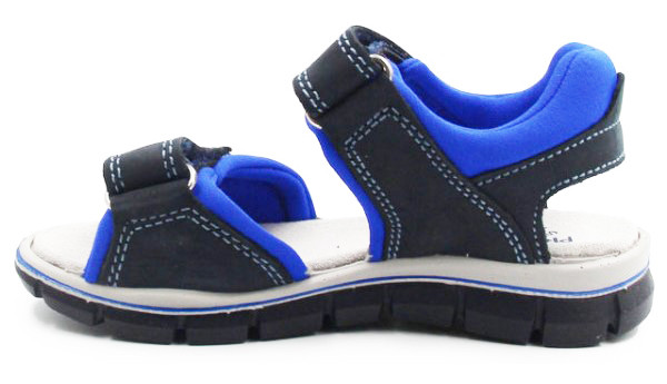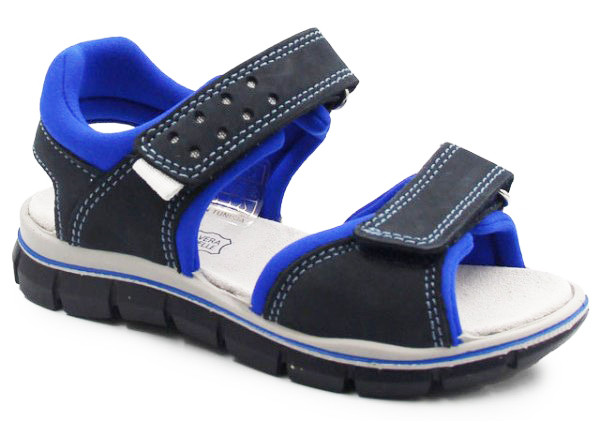Chłopięce sandały wykonane z miękkich tkanin. Wkładka posiada kilka warstw, co zapewnia miękkość i amortyzację podczas chodzenia. Zapinane za pomocą dwóch rzepów, dając przy tym możliwość indywidualnego dopasowania do szerokości stopy dziecka. Wykonane w klasycznej kolorystyce (odcienie granatowego oraz dodatki koloru niebieskiego). Podeszwa posiada system Shock Absorber. Jest podwyższona w okolicach pięty, co daje dodatkową amortyzację, w miejscu gdzie stopa jest narażona najbardziej na wstrząsy od podłoża.