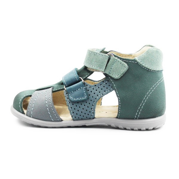 Sandałki z zabudowanymi palcami. Zapinane za pomocą praktycznych rzepów, który jest szybki w stosowaniu i umożliwia dopasowanie do indywidualnych potrzeb stopy. Podeszwa ORTHO LINE, wspiera prawidłowe podparcie dla stopy dziecka już od pierwszych kroków.