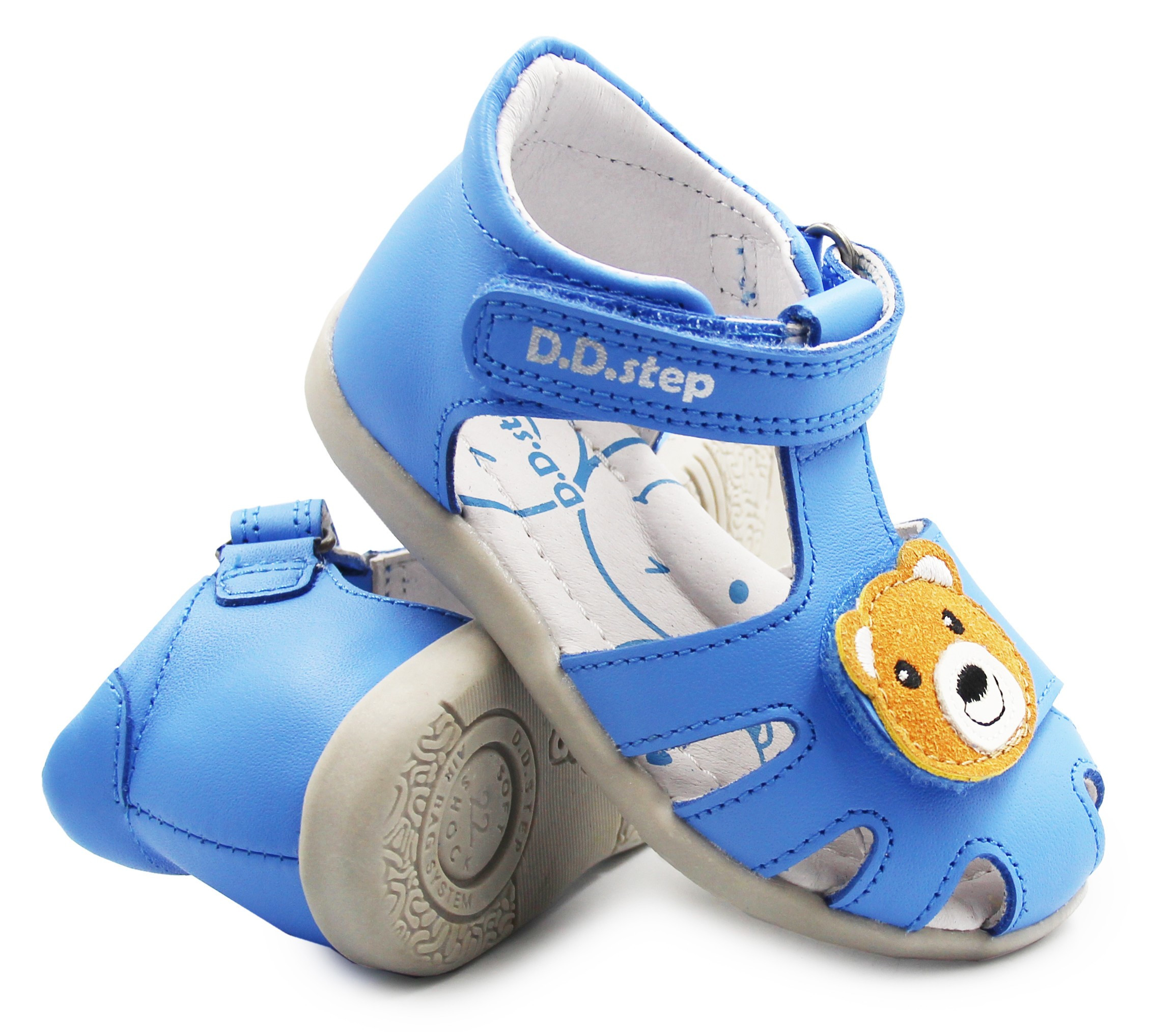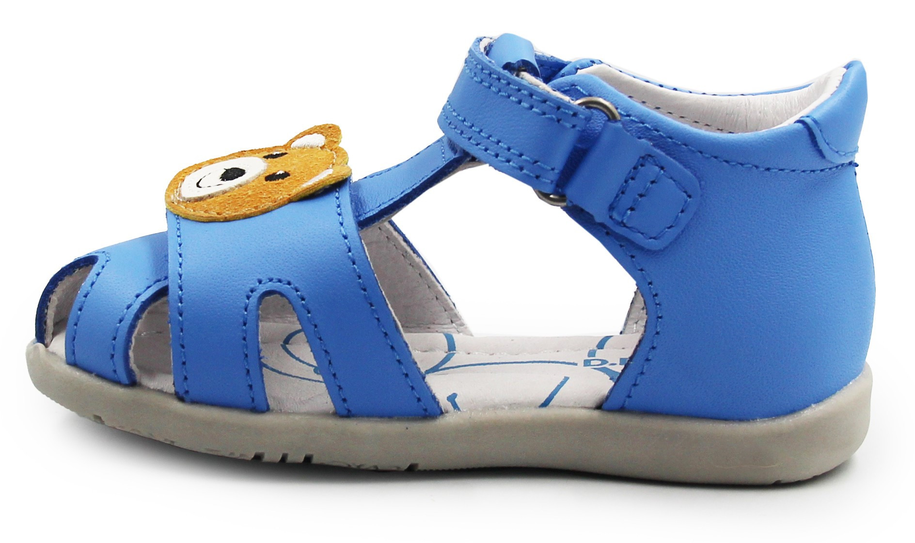 Niebieskie sandałki dziecięce z uroczym misiem. Wykonane z wysokiej jakości skóry naturalnej, która pozwala skórze oddychać. Podeszwa posiada właściwości amortyzujące wstrząsy podłoża na jakie narażona jest stopa podczas chodzenia. System zapinania na rzepy umożliwia proste i szybkie dostosowanie obuwia do stopy dziecka.