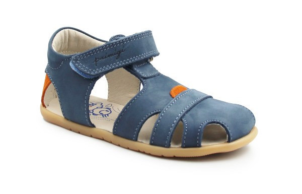 Skórzane sandałki dziecięce z elastyczną podeszwą, która zapewnia stopie naturalny ruch podczas poruszania. Zapinane za pomocą dwóch praktycznych rzepów. Kołnierz wypełniony jest miękką pianką.