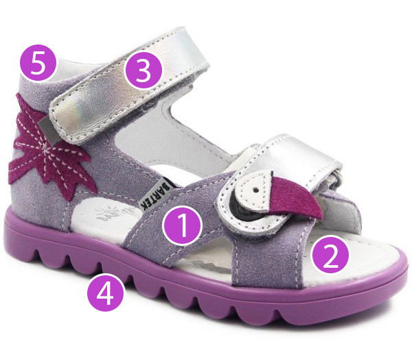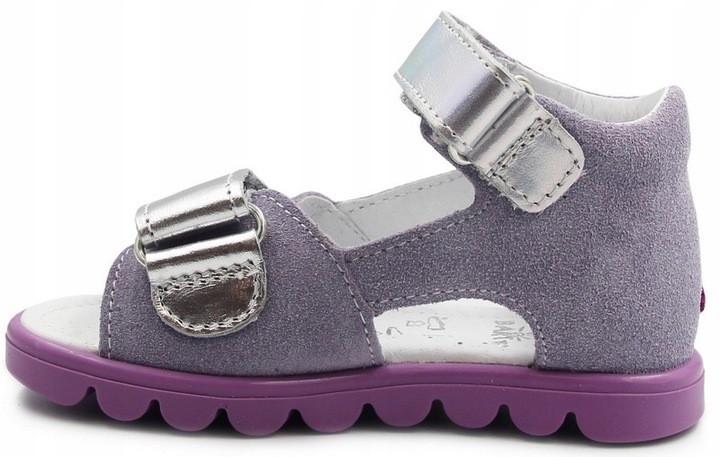 Sandały dziewczęce z zabudowana piętą, w uroczym kolorze oraz wakacyjnym wzorem. Cholewka została wykonana ze skóry naturalnej licowej oraz weluru. W okolicach pięty zastosowano miękką pianką, która ma na celu zapobieganie powstawaniu odcisków. Wkładka posiada właściwości oddychające, by stopa mogła swobodnie oddychać. Zapięcie za pomocą dwóch rzepów umożliwia dziecku samodzielne zakładanie i zdejmowanie butów oraz dopasowanie do stopy.