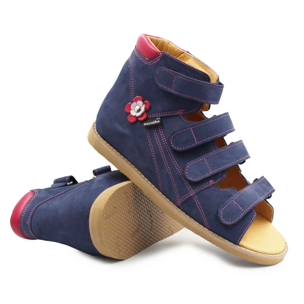 Sandały Aurelka to połączenie stabilnego obuwia ortopedycznego z wygodą i lekkością codziennych butów dla dzieci. Dzięki płaskiej wkładce można w nich stosować indywidualne wkładki lub elementy korygujące, a specjalna konstrukcja sprawia, że buty sprawdzą się również w połączeniu z ortezami.