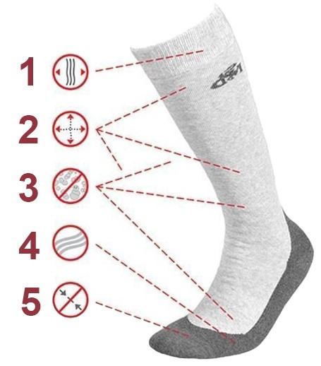 Zaprojektowane tak, by dopasować się do kształtu nóg bez ucisku. Jest to możliwe dzięki specjalnej konstrukcji cholewki i domieszce lycry. Taka budowa zapewnia maksymalną elastyczność, nie blokując przepływu krwi i dając komfort nawet opuchniętym nogom. Dodatkowo, podkolanówki zawierają apreturę Sanitized, która działa antybakteryjnie i przeciwgrzybiczo, hamując rozwój mikrobów i zapobiegając nieprzyjemnemu zapachowi. Trójwarstwowa dzianina frotte chroni stopy przed otarciami, a elastyczna opaska na śródstopiu zapobiega zsuwaniu się podkolanówek. Do ich produkcji użyto wysokiej jakości, naturalnej bawełny.