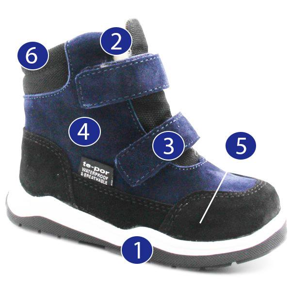 - Ochronę przed wilgocią: Membrana Te-Por zapobiega przenikaniu wody do wnętrza buta, dzięki czemu stopy dziecka pozostają suche nawet w deszczu lub śniegu.