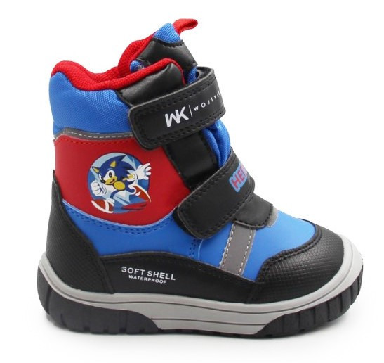 Chłopięce buty na zimę, wewnątrz otulone miękkim materiałem który ogrzewa stopę podczas chłodniejszych temperatur. Zapinane za pomocą dwóch rzepów, które są łatwe, szybkie oraz praktyczne. Dodatkowo buty zostały wyposażone w ozdobny element postaci Sony.