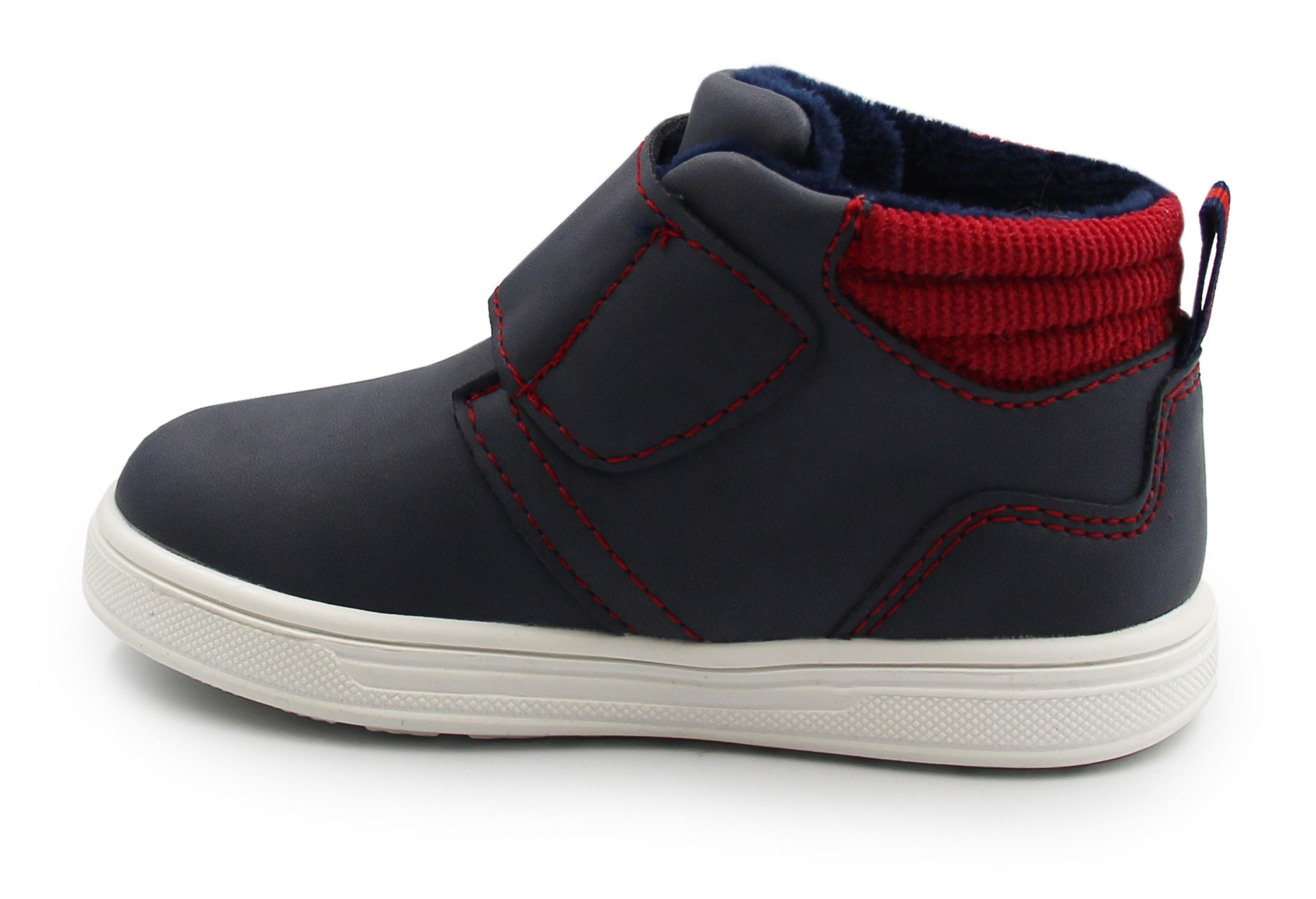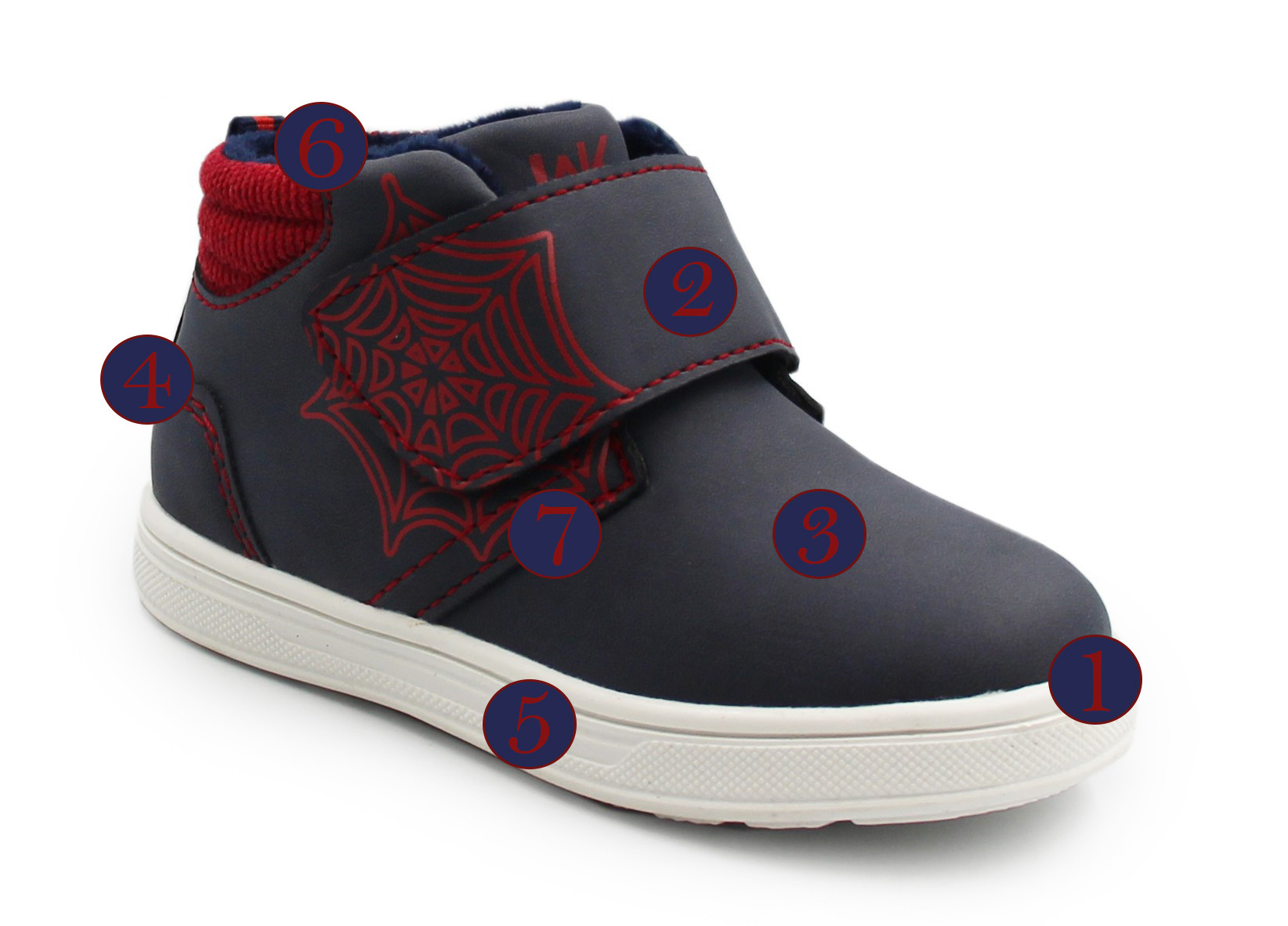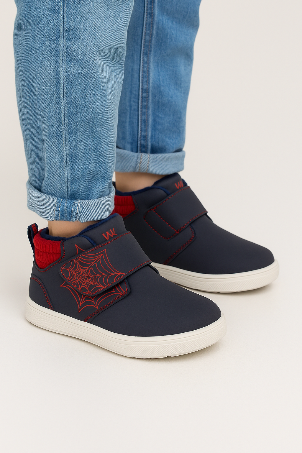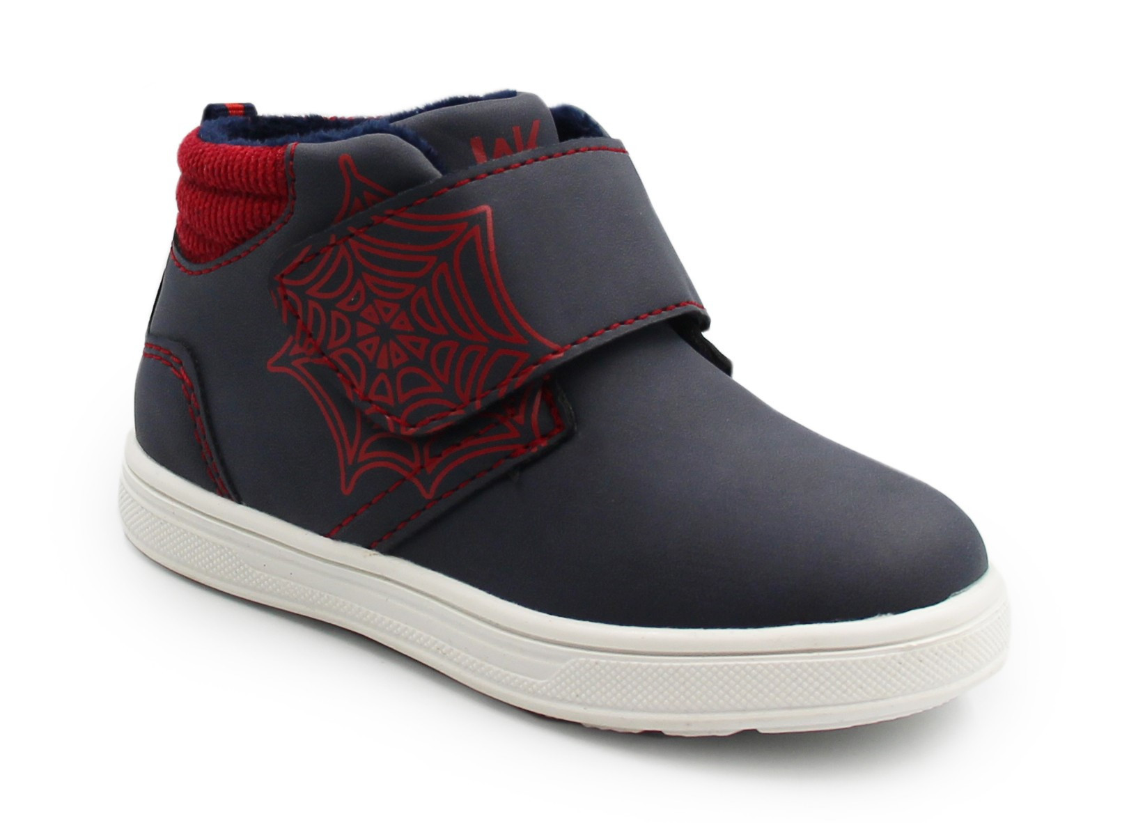 Chłopięce buty wypełnione wewnątrz miękkim materiałem, który otula stopę podczas chłodniejszych temperatur. Zapiętek stabilizuje stopę i utrzymuje ją w prawidłowej pozycji. Zapinane za pomocą praktycznego rzepu. Z boku obuwia znajduje się motyw pajęczyny.