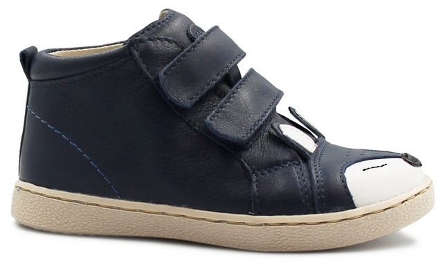 Przód bucików zdobią słodkie pyszczki lisków. Buty wykonane są z wysoko jakościowej skóry naturalnej, w kolorze granatowym, co zapewnia cyrkulację powietrza, stopy nie będą się w nich nadmiernie pocić i wydzielać nieprzyjemnego zapachu. Górna część cholewki została wykończona kołnierzem wypełnionym pianką, który eliminuje ewentualne uciski i zapobiega otarciom.