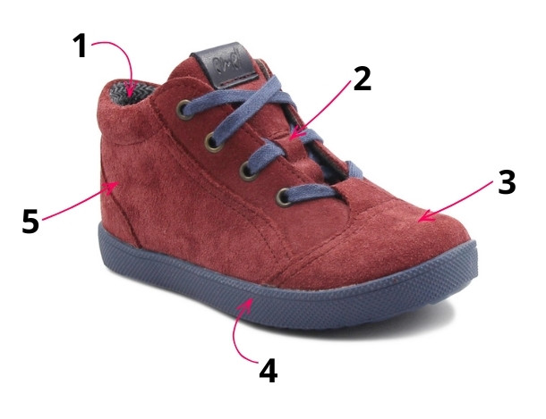 Stabilny, usztywniony zapiętek pomaga utrzymać stopę w odpowiednim ułożeniu podczas nauki chodzenia, a miękki kołnierz wokół kostki zwiększa komfort noszenia.