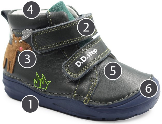 - Wolność ruchów: dzięki elastyczności podeszwy, stopa dziecka może swobodnie się zginać