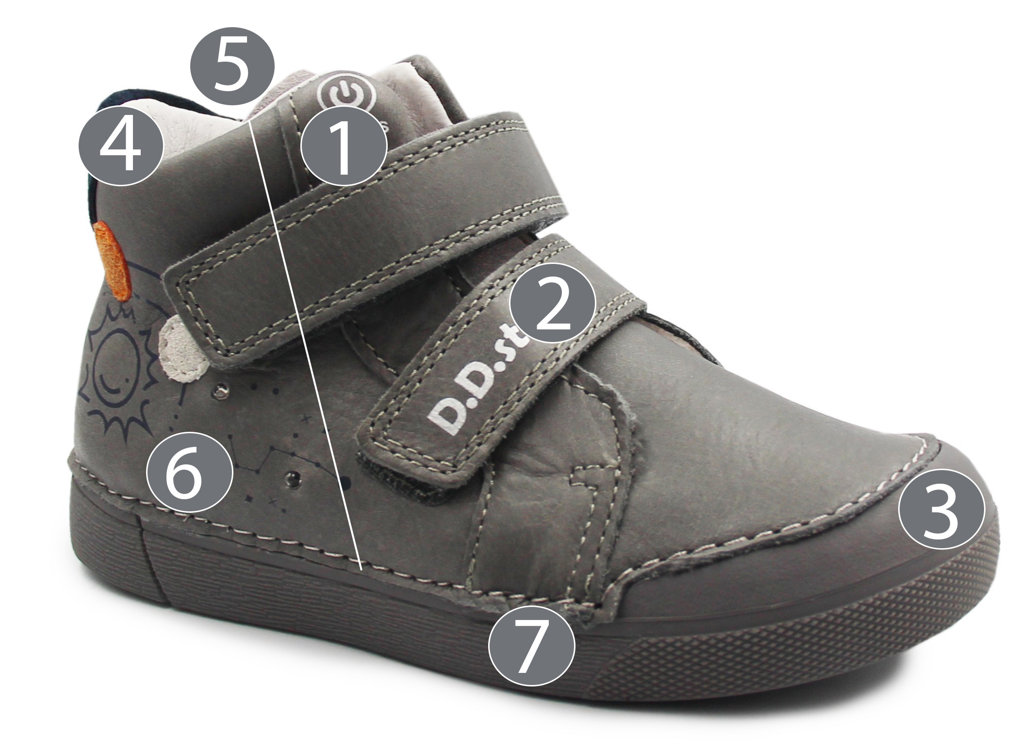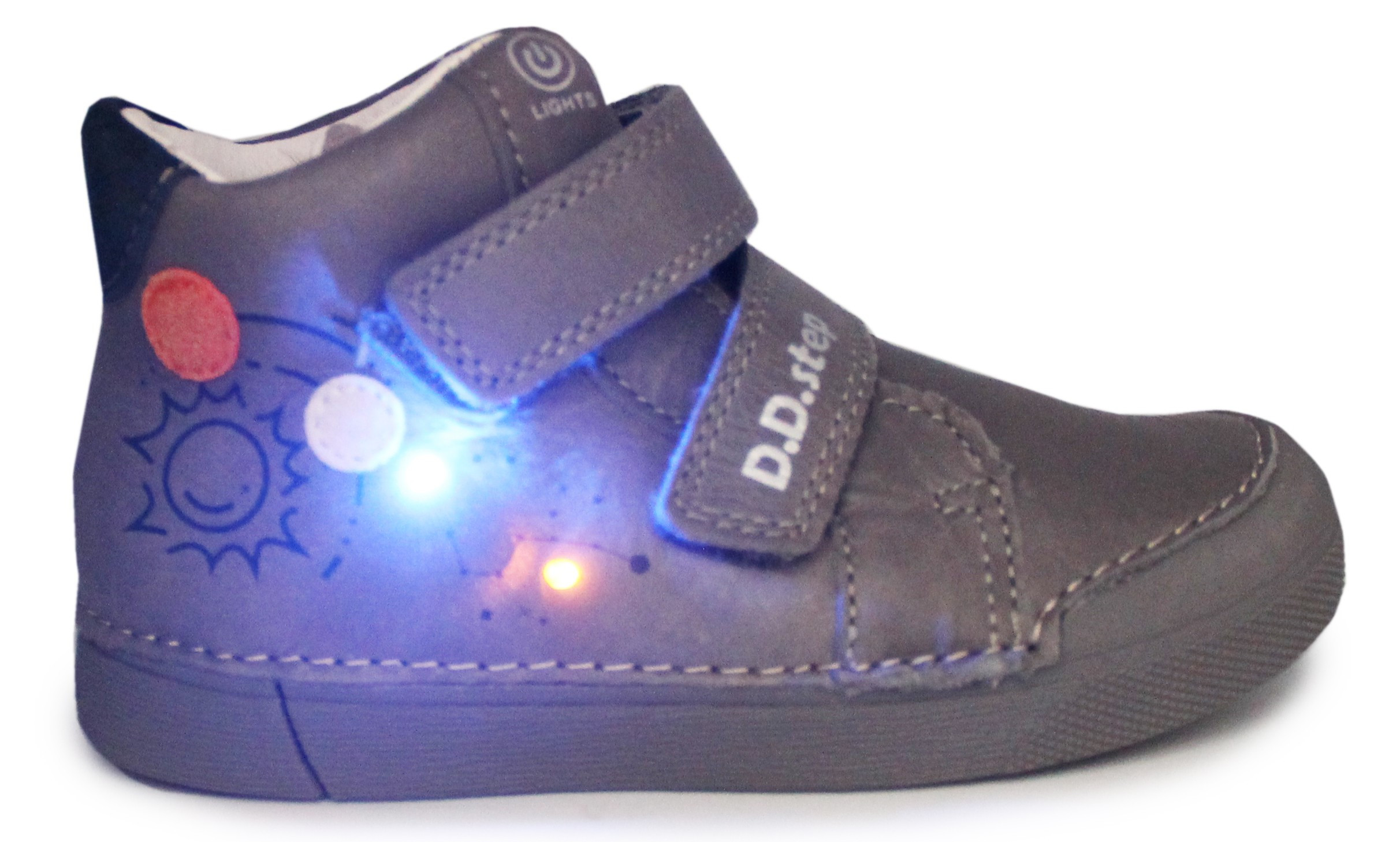 Buty posiadają światełka Led, które włączają się przy użyciu przycisku. Zapinane na rzep, umożliwiają dopasowanie do szerokości stopy. Wkładka wykonana jest ze skóry naturalnej oraz posiada możliwość wyjmowania. Zapiętek obuwia jest miękki co sprzyja poprawie komfortu podczas chodzenia.