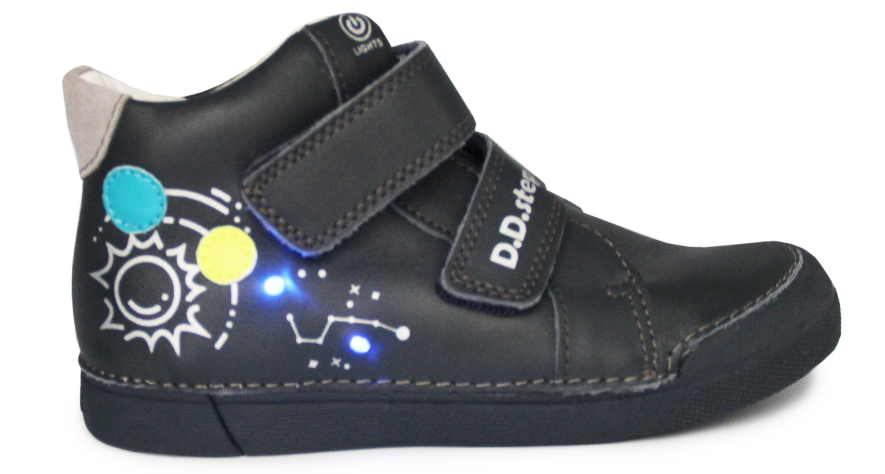 Buty posiadają światełka Led, które włączają się przy użyciu przycisku. Zapinane na rzep, umożliwiają dopasowanie do szerokości stopy. Wkładka wykonana jest ze skóry naturalnej oraz posiada możliwość wyjmowania. Zapiętek obuwia jest miękki co sprzyja poprawie komfortu podczas chodzenia.