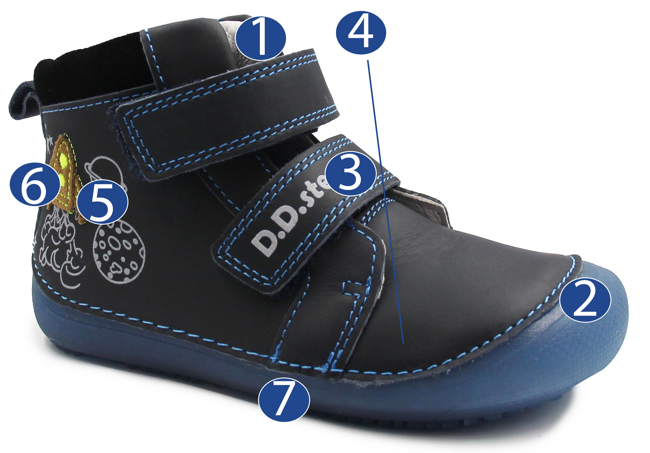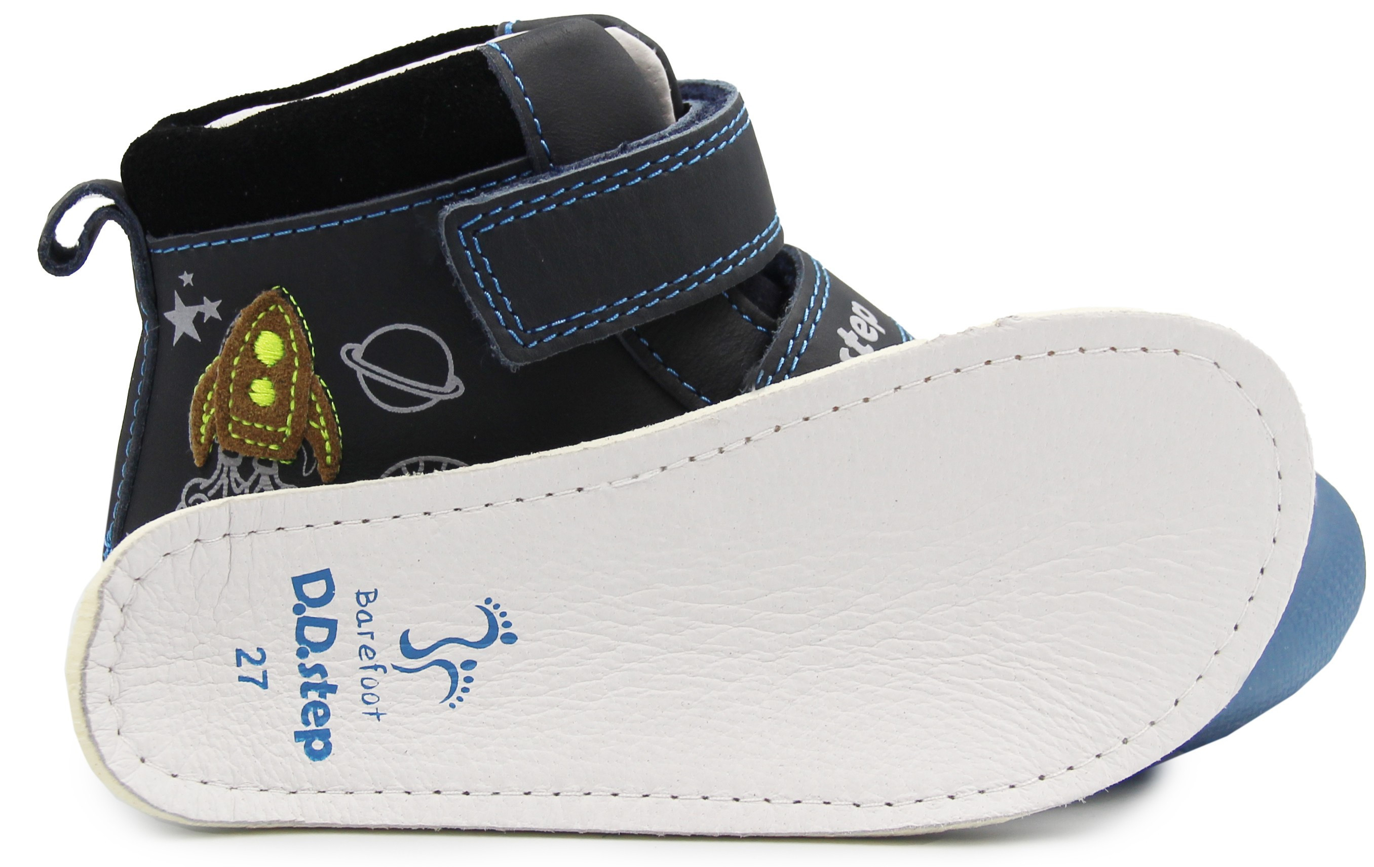 Chłopięce buty wykonane ze skóry naturalnej (licowanej). Wyposażone w dwa wygodne oraz praktyczne rzepy. Podeszwa jest bardzo elastyczna i pozwala stopie na naturalny oraz swobodny ruch. Wkładka jest wyjmowana, posiada zerowy spadek. Obuwie posiada miękki zapiętek. Z boku buty posiadają ozdobne elementy, które spodobają się małym astronautom.