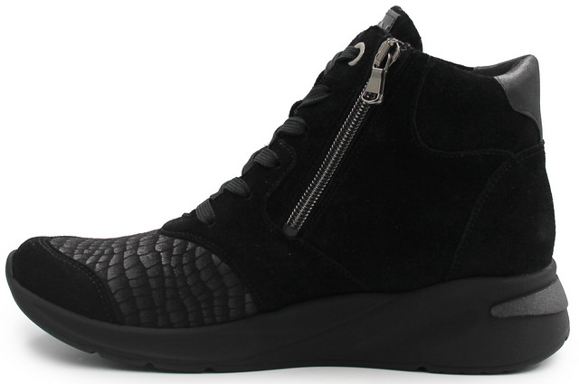 Damskie botki z ociepleniem o poszerzonej tęgości, zapinane za pomocą sznurowadeł oraz zamka błyskawicznego z ozdobnym nadrukiem imitacji wężowej. Wyposażone w wyjmowaną wkładkę. Wykonane z wysokiej jakości materiałów skóry nubukowej, syntetycznej, zamszowej oraz skór naturalnych, które dopasowują się do stopy nie powodując ucisków.