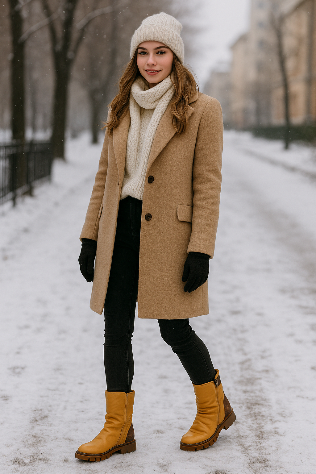 - modny kolor musztardowo-żółty, który wyróżnia się w zimowych stylizacjach