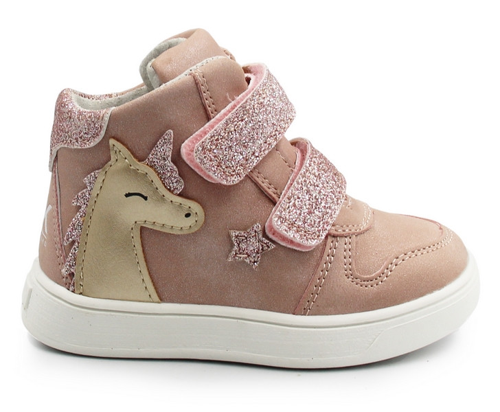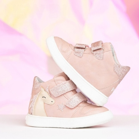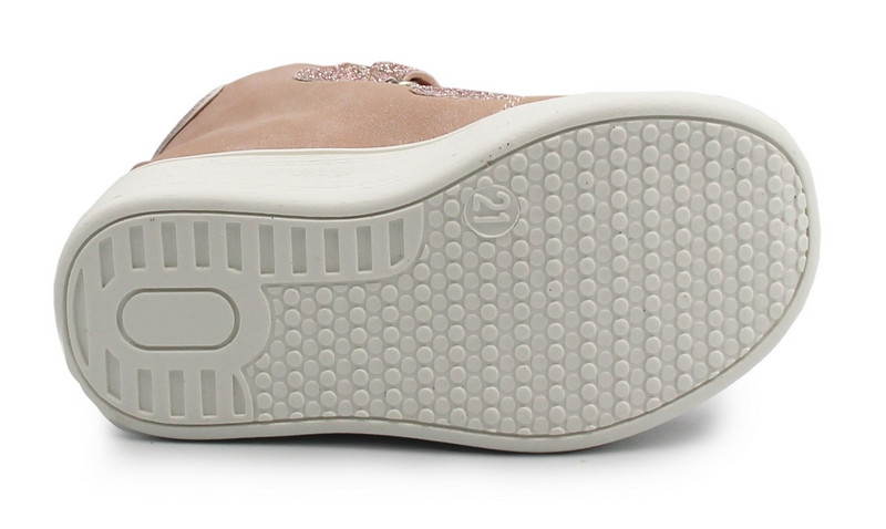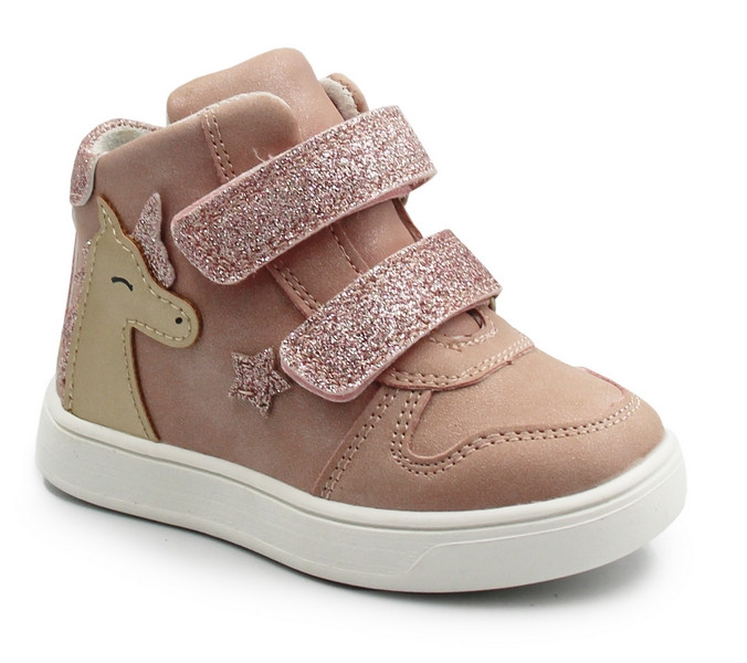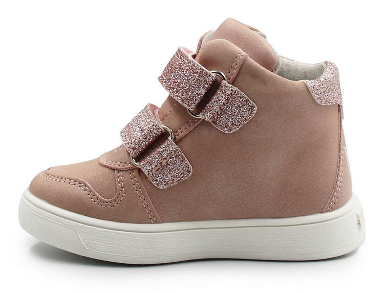 Dziewczęce buty wykonane ze skóry ekologicznej, zapinane za pomocą regulowanego rzepu, który umożliwia dziecku samodzielne założenie oraz zdejmowanie obuwia. Wnętrze wykonane jest ze skóry, co zapewnia odpowiednią wentylację. Czubki dodatkowo zabezpieczają palce. Wkładka wykonana jest z podwójnego materiału. Podklejona jest warstwą miękkiej pianki co znacznie poprawia komfort podczas użytkowania. Pianka zapewnia dodatkową amortyzację, co jest szczególnie ważne dla aktywnych dzieci.