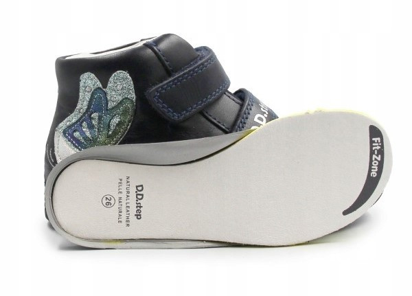 Wykonane z wysokiej jakości skóry naturalnej, posiadają wyjmowaną, skórzaną wkładkę, która gwarantuje doskonałe dopasowanie. Dzięki praktycznym rzepom, zakładanie jest szybkie i łatwe, a szerokość buta można precyzyjnie dopasować do stopy. Podeszwa z naturalnego kauczuku jest odporna na uderzenia, ale także zapewnia świetną przyczepność. Buty są przy tym lekkie i elastyczne, wspierając naturalny sposób poruszania się. Buty wyróżniają się aplikacją z motywem motylka z boku.