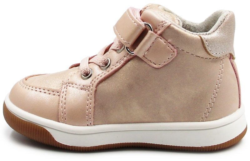 Dziewczęce buty wykonane ze skóry, zapinane za pomocą praktycznego rzepu, który umożliwia dziecku samodzielne założenie oraz zdejmowanie obuwia. Wnętrze wykonane jest ze skóry, co zapewnia odpowiednią wentylację. Czubki dodatkowo zabezpieczają palce. Wkładka wykonana jest z podwójnego materiału. Podklejona jest warstwą miękkiej pianki co znacznie poprawia komfort podczas użytkowania. Pianka podklejona pod skórą zapewnia dodatkową amortyzację, co jest szczególnie ważne dla aktywnych dzieci. Poniżej rzepu znajdują się gumy ściągające.