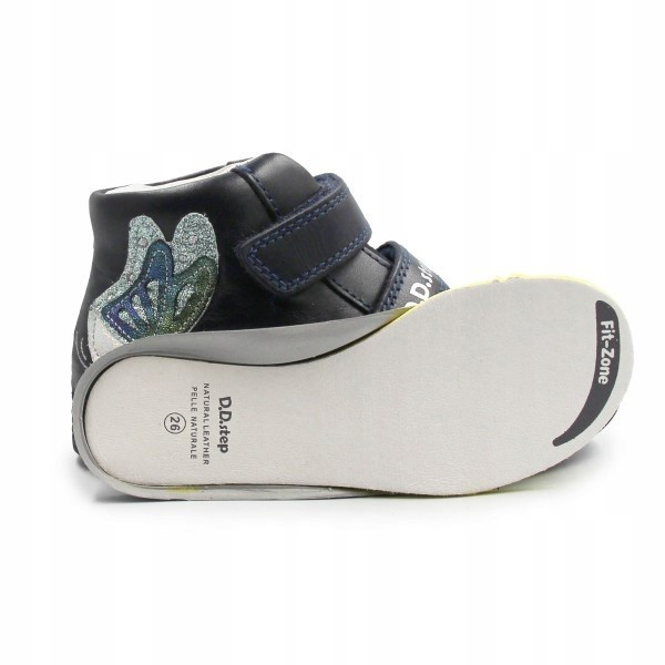 Wykonane z wysokiej jakości skóry naturalnej, posiadają wyjmowaną, skórzaną wkładkę, która gwarantuje doskonałe dopasowanie. Dzięki praktycznym rzepom, zakładanie jest szybkie i łatwe, a szerokość buta można precyzyjnie dopasować do stopy. Podeszwa z naturalnego kauczuku jest odporna na uderzenia, ale także zapewnia świetną przyczepność. Buty są przy tym lekkie i elastyczne, wspierając naturalny sposób poruszania się. Buty wyróżniają się aplikacją z motywem motylka z boku.
