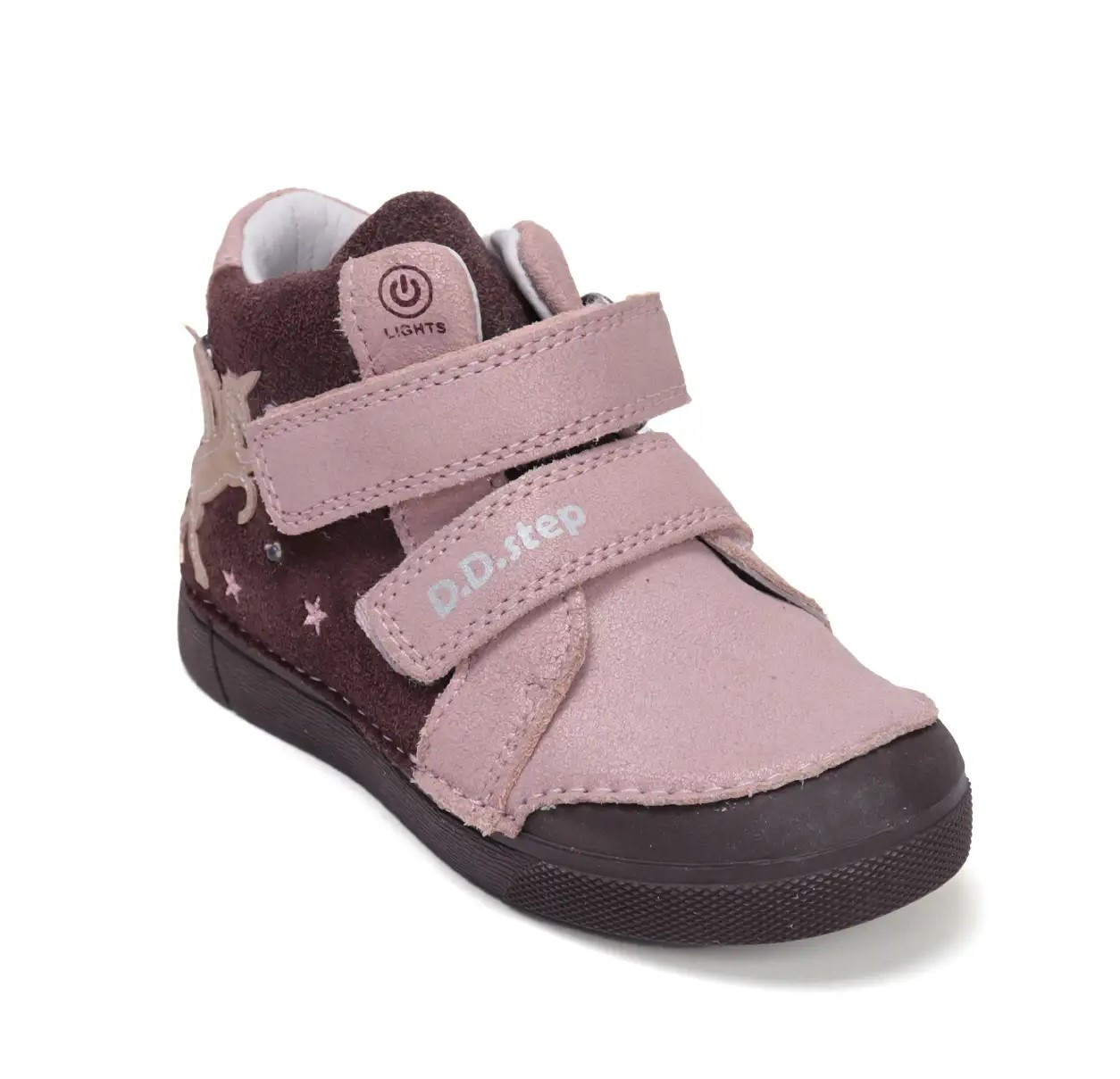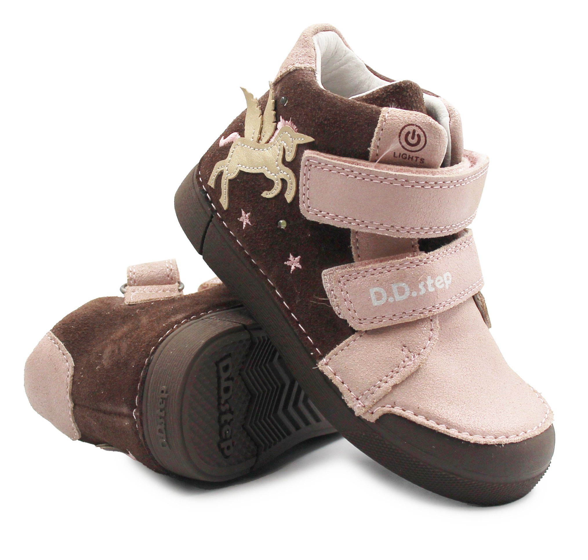 Wykonane z wysokiej jakości skóry naturalnej, posiadają wyjmowaną, skórzaną wkładkę, która gwarantuje doskonałe dopasowanie. Dzięki praktycznym rzepom, zakładanie jest szybkie i łatwe, a szerokość buta można precyzyjnie dopasować do stopy.Wyjątkową atrakcją są wbudowane diody LED, które zapalają się podczas kroku. Podeszwa z naturalnego kauczuku jest odporna na uderzenia, ale także zapewnia świetną przyczepność. Buty są przy tym lekkie i elastyczne, wspierając naturalny sposób poruszania się. Buty wyróżniają się aplikacją z motywem jednorożca z boku.