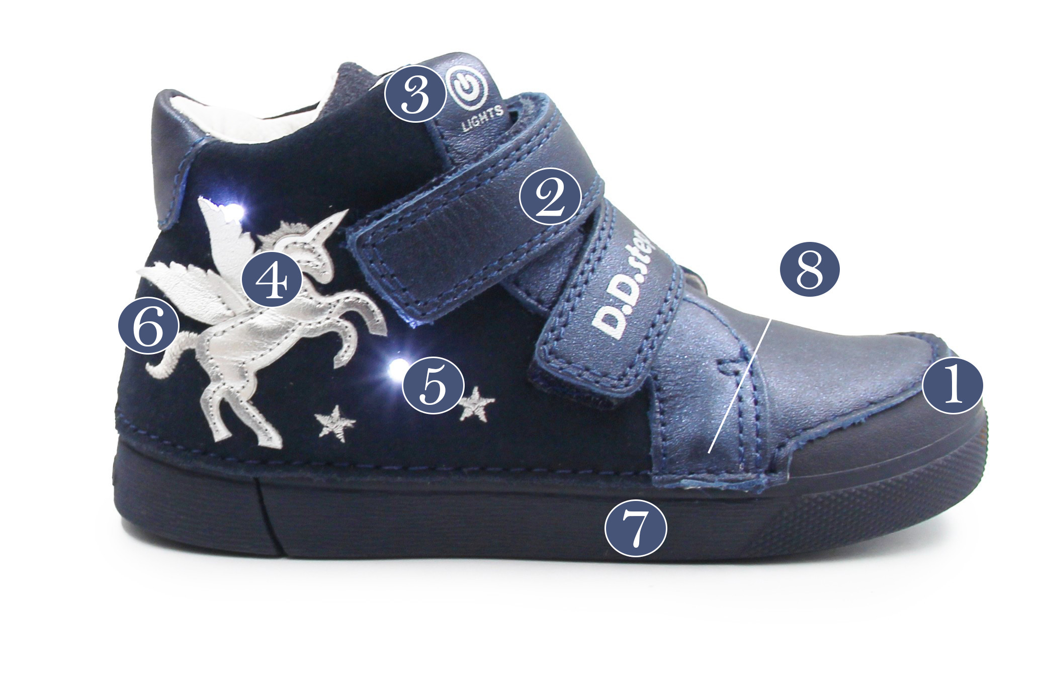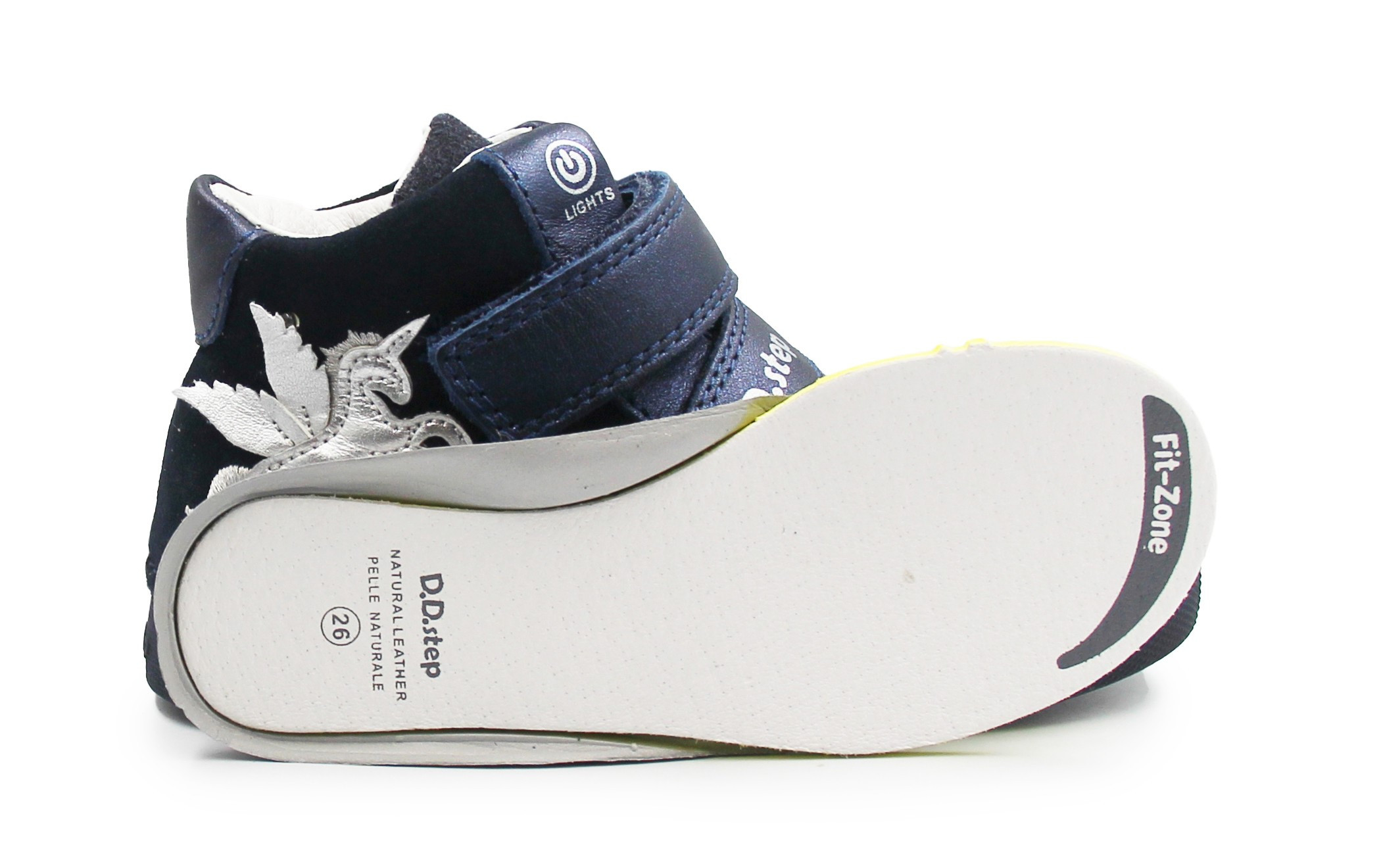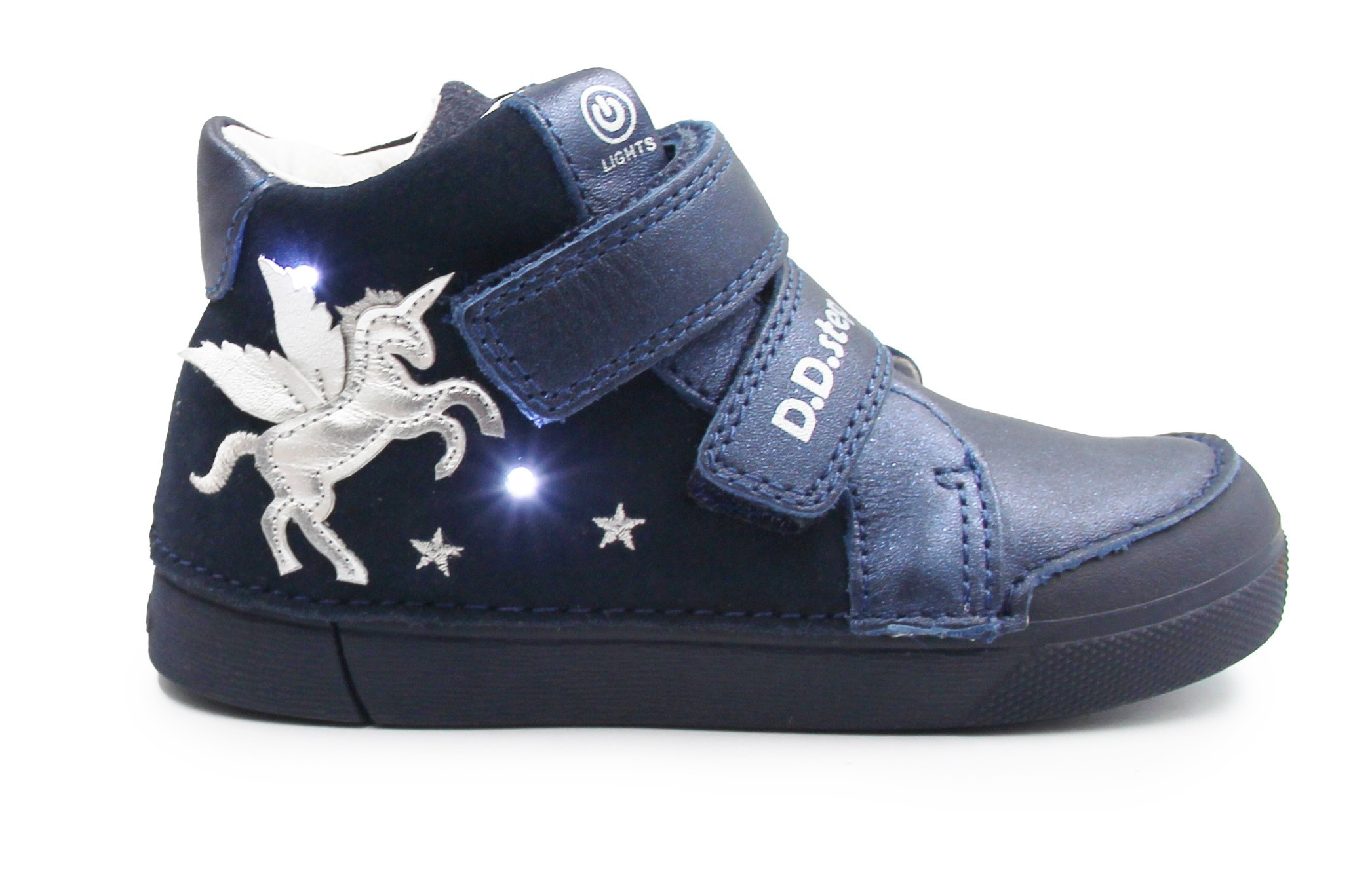 Wykonane z wysokiej jakości skóry naturalnej, posiadają wyjmowaną, skórzaną wkładkę, która gwarantuje doskonałe dopasowanie. Dzięki praktycznym rzepom, zakładanie jest szybkie i łatwe, a szerokość buta można precyzyjnie dopasować do stopy.Wyjątkową atrakcją są wbudowane diody LED, które zapalają się podczas kroku. Podeszwa z naturalnego kauczuku jest odporna na uderzenia, ale także zapewnia świetną przyczepność. Buty są przy tym lekkie i elastyczne, wspierając naturalny sposób poruszania się. Buty wyróżniają się aplikacją z motywem jednorożca z boku.